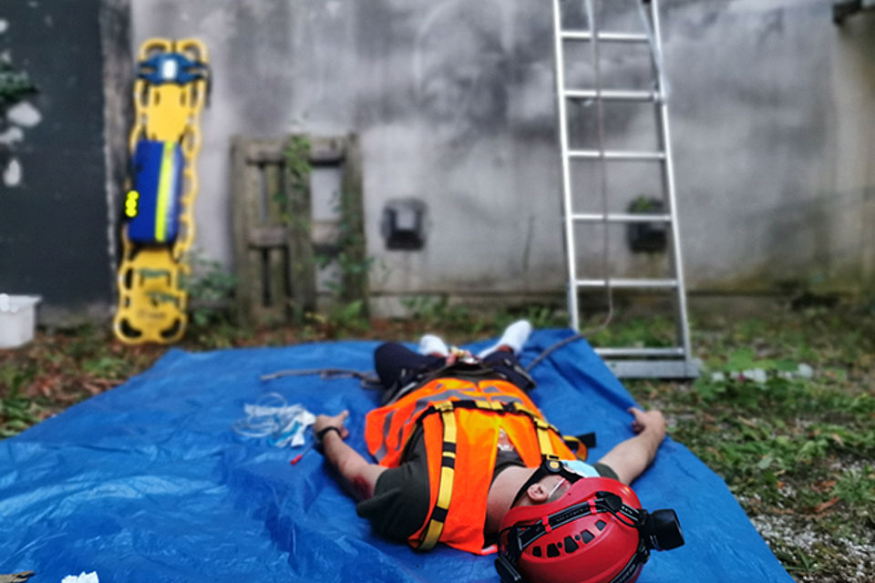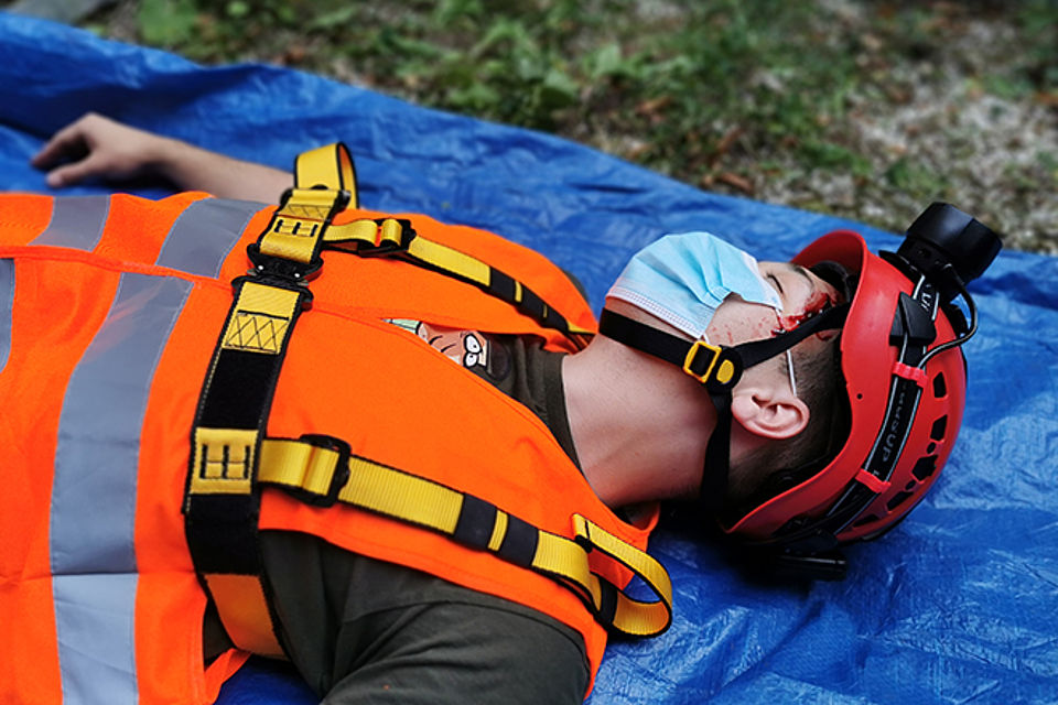 Bei der Station 2 wurde ein Trauma-Patient behandelt. Ein Bauarbeiter, der von einer Mime gespielt wurde, ist nach dem Fallbeispielszenario von einer ca. 3 Meter hohen Leiter gestürzt und war initial (beim Auffinden) bewusstlos. Nachdem der Verletzte wieder zu sich kam, klagte er über starke Schmerzen und konnte sich an den Unfallhergang nicht mehr erinnern. Hier hieß es das s.g. ABCDE-Schema anzuwenden, die verletzte Person richtig zu immobilisieren und bis zum Eintreffen der nachgeforderten Rettungskräfte intensiv zu betreuen.