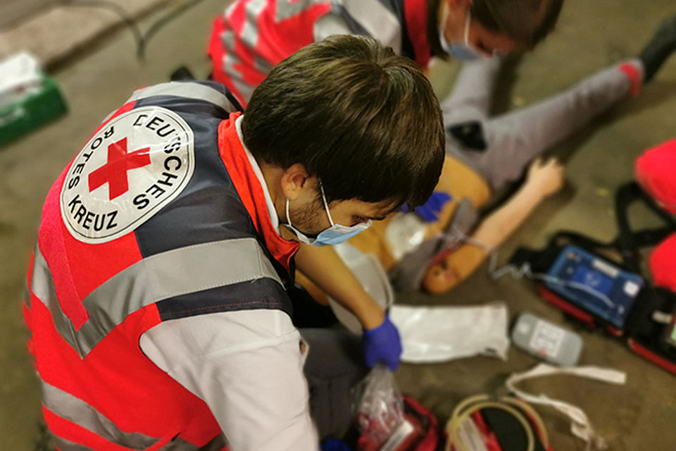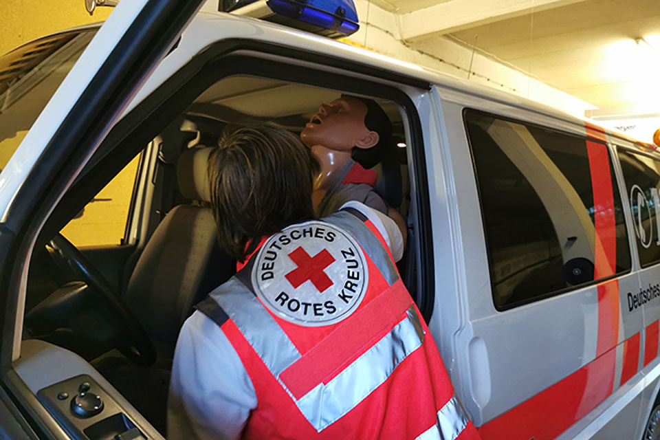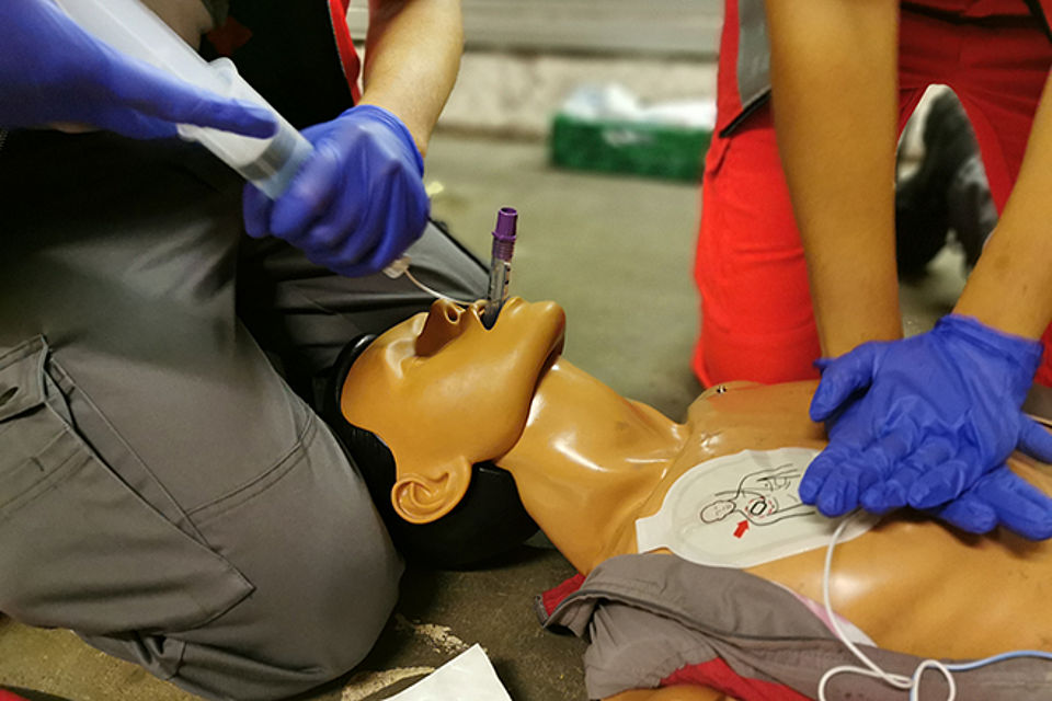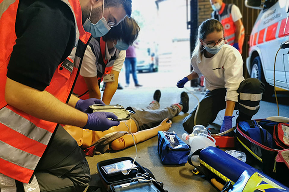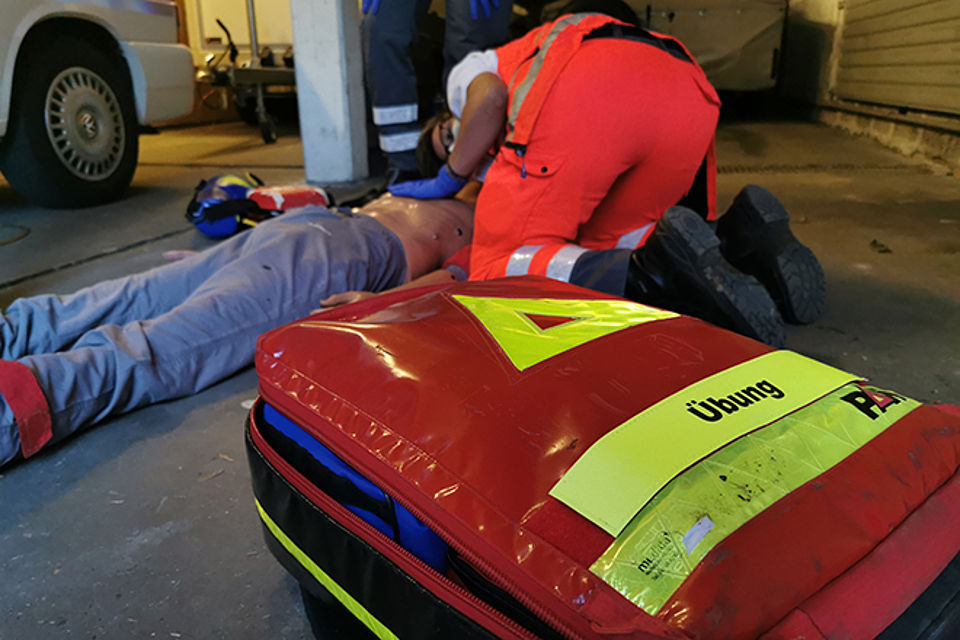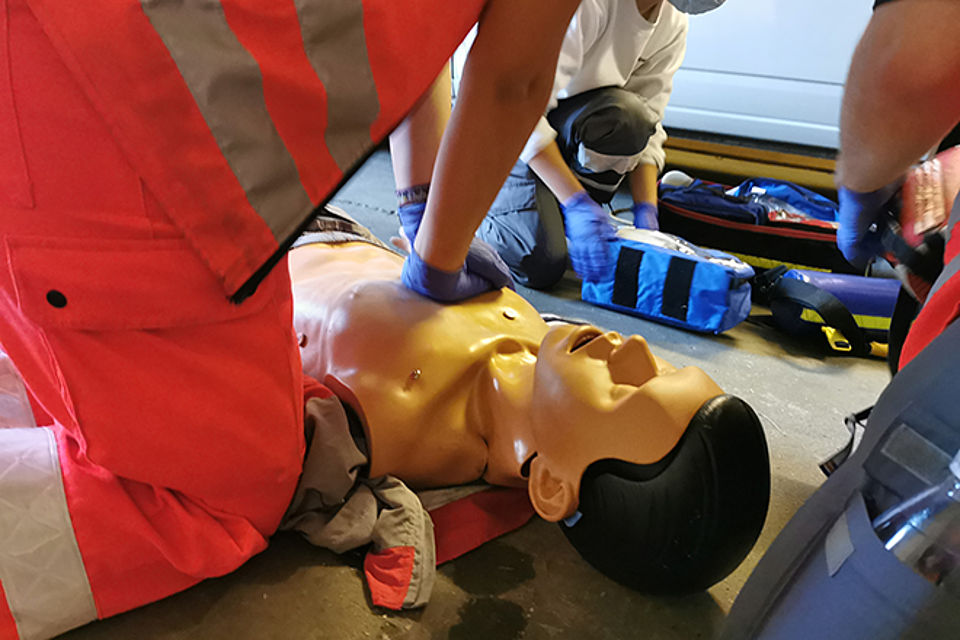 Die Station 1 beschäftigte sich mit der Reanimation. Hierbei wurden zunächst die Basics, wie richtiger Druckpunkt und richtige Drucktiefe bei der Herzdruckmassage sowie Masken-Beutel-Beatmung, besprochen und geübt. Anschließend wurde auf die richtige Position der AED-Pads und Intubation mittels eines Larynxtubus im Rahmen des ALS (Advanced Life Support) eingegangen. Nachdem die Grundlagen besprochen und nochmal geübt wurden, haben die Fußtrupps ein Fallbeispiel abgearbeitet, bei dem eine bewusstlose Person aus dem PKW gerettet und anschließend reanimiert werden musste.