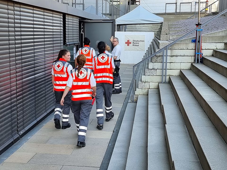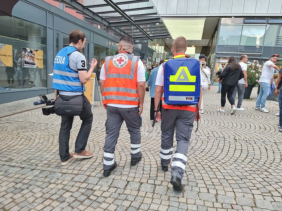 In den Abendstunden nahm die Anzahl an den Einsätzen deutlich zu. Hessens größtes Innenstadtfest macht Darmstadt zur Festmeile. Fahrgeschäfte, Live-Bühnen, Kulturveranstaltungen, Essens- und Getränkestände lockten im Laufe des Abends tausende Besucher zum Heinerfest. Besonderheit heute war, dass uns ein Filmteam des Hessischen Rundfunks begleitet hat. Im Rahmen der Hessenschau wird über unsere ehrenamtliche Arbeit berichtet. Das Filmteam begleitete unsere DRK Sanitäter*innen Ahmet Kalayci, Anna Sviridova und Moritz Gaug.